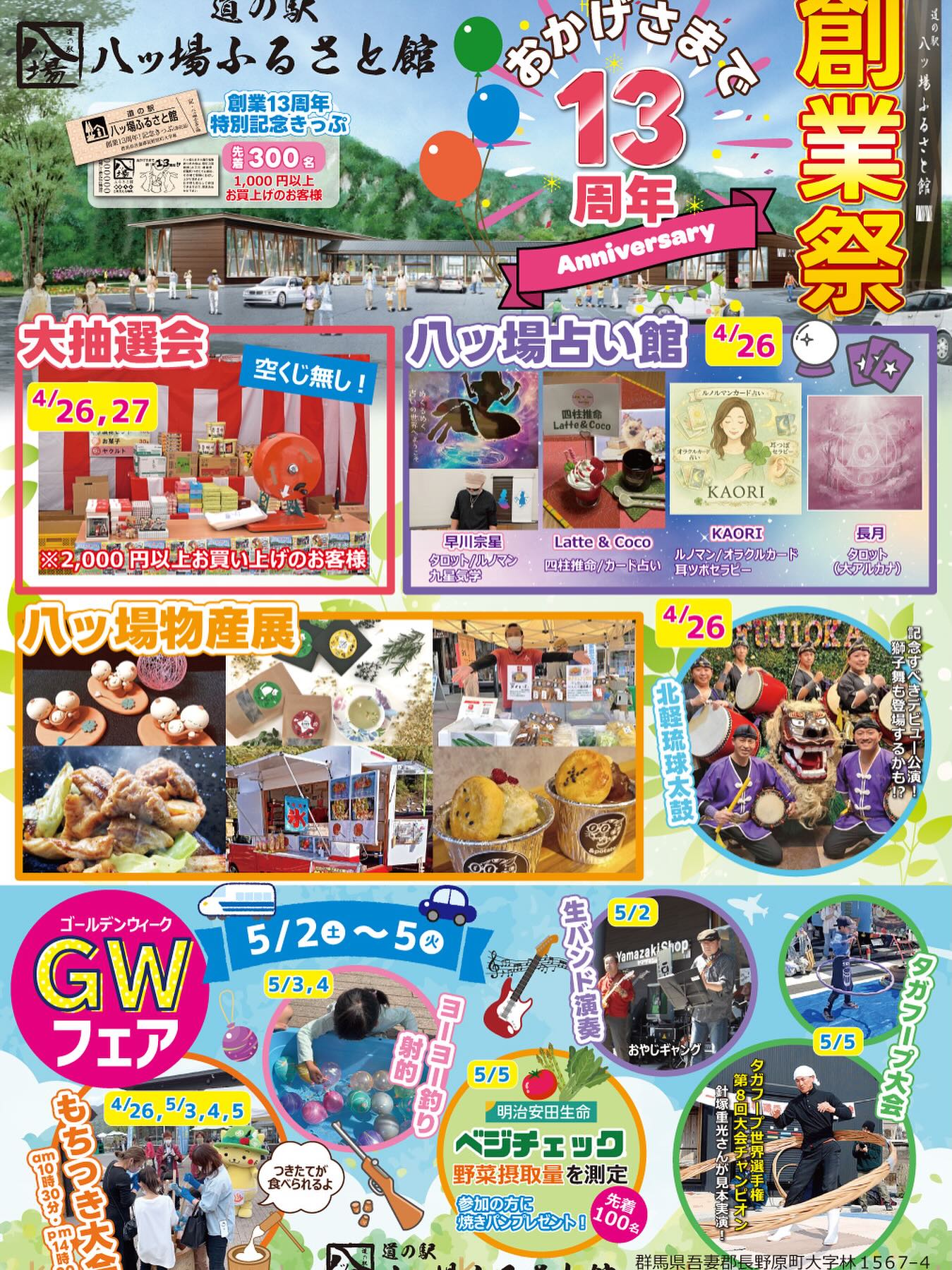 \おかげさまで13周年🎉/ 道の駅八ッ場ふるさと館では、感謝の気持ちを込めて ✨創業祭&ゴールデンウィークフェア✨を開催します! 📅開催期間 4/26(日)〜5/5(火) ———🌸創業祭🌸——— 📍4/26〜4/27 🎫特別記念キップ(先着300名様) ※1,000円以上お買い上げの方 🎁空クジなし!大抽選会 ※2,000円以上お買い上げの方限定 🎍つきたてが食べられる餅つき大会 🕥10:30〜/🕑14:00〜 🔮占いフェス(4/26限定) 人気占い師が大集合✨ 🥁北軽琉球太鼓(4/26) 🕛12:15〜/🕒15:00〜 ———🌿GWフェア🌿——— 📍5/2〜5/5 🎪八ッ場物産展(4/27〜5/5) 🎸生バンド演奏(5/2) 🎯こども縁日(5/3・4) 🥕ベジチェック(5/5) 野菜摂取量を測定して、焼きパンGET! ⭕️タガフープ大会 大きな樽のタガを回してチャレンジ🔥 ——— ご家族みんなで楽しめるイベント盛りだくさん! 春のおでかけは八ッ場へ🚗🌸 皆さまのご来場お待ちしております✨ #道の駅八ッ場ふるさと館 #道の駅 #八ッ場ダム #八ッ場 #群馬観光 #GWイベント #ゴールデンウィーク #家族でおでかけ #イベント情報 #餅つき大会 #抽選会 #子どもとお出かけ #長野原町 #top
